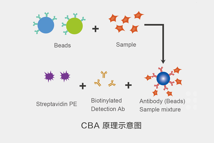 包被細(xì)胞因子特異性抗體的熒光磁性微球與待測(cè)樣本孵育,可與樣本中相應(yīng)的細(xì)胞因子特異性結(jié)合,加入生物素標(biāo)記的檢測(cè)抗體后,形成抗體包被微球-細(xì)胞因子-檢測(cè)抗體的免疫復(fù)合物;最后加入SAV-PE,通過流式細(xì)胞儀檢測(cè),熒光強(qiáng)度與樣本中細(xì)胞因子的含量成正比,最后結(jié)合細(xì)胞因子標(biāo)準(zhǔn)品的標(biāo)準(zhǔn)曲線,從而實(shí)現(xiàn)對(duì)同一份樣本中細(xì)胞因子的定量檢測(cè)。
