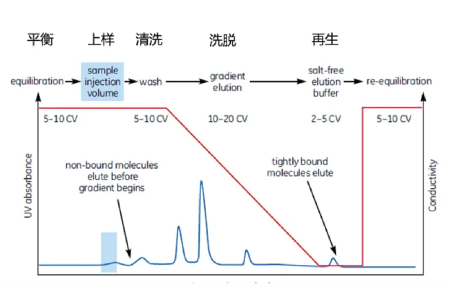 離子交換層析是基于蛋白質(zhì)和離子交換層析介質(zhì)之間的電荷相互作用進(jìn)行分離。離子交換層析介質(zhì)通常帶有正或負(fù)電荷,吸附帶有相反電荷的蛋白質(zhì)。通過調(diào)整緩沖液的離子濃度或pH值,可以改變蛋白質(zhì)與介質(zhì)的結(jié)合強度,實現(xiàn)不同蛋白質(zhì)的分離。